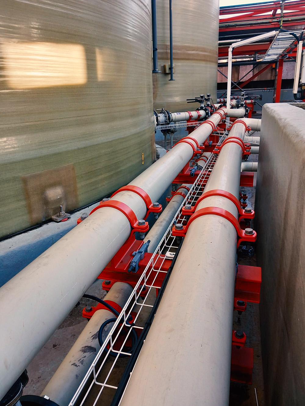 Een belangrijk onderdeel van dit project was de toepassing van dubbel gelamineerde pijpleidingen. Deze pijpleidingen bestaan uit een kern van polypropyleen (PP) die is omhuld met een glasvezelversterkte buitenlaag (GRP). Deze constructie biedt een uitstekende combinatie van chemische bestendigheid en mechanische sterkte. Het lasproces is een precisiewerk dat in twee stappen wordt uitgevoerd: