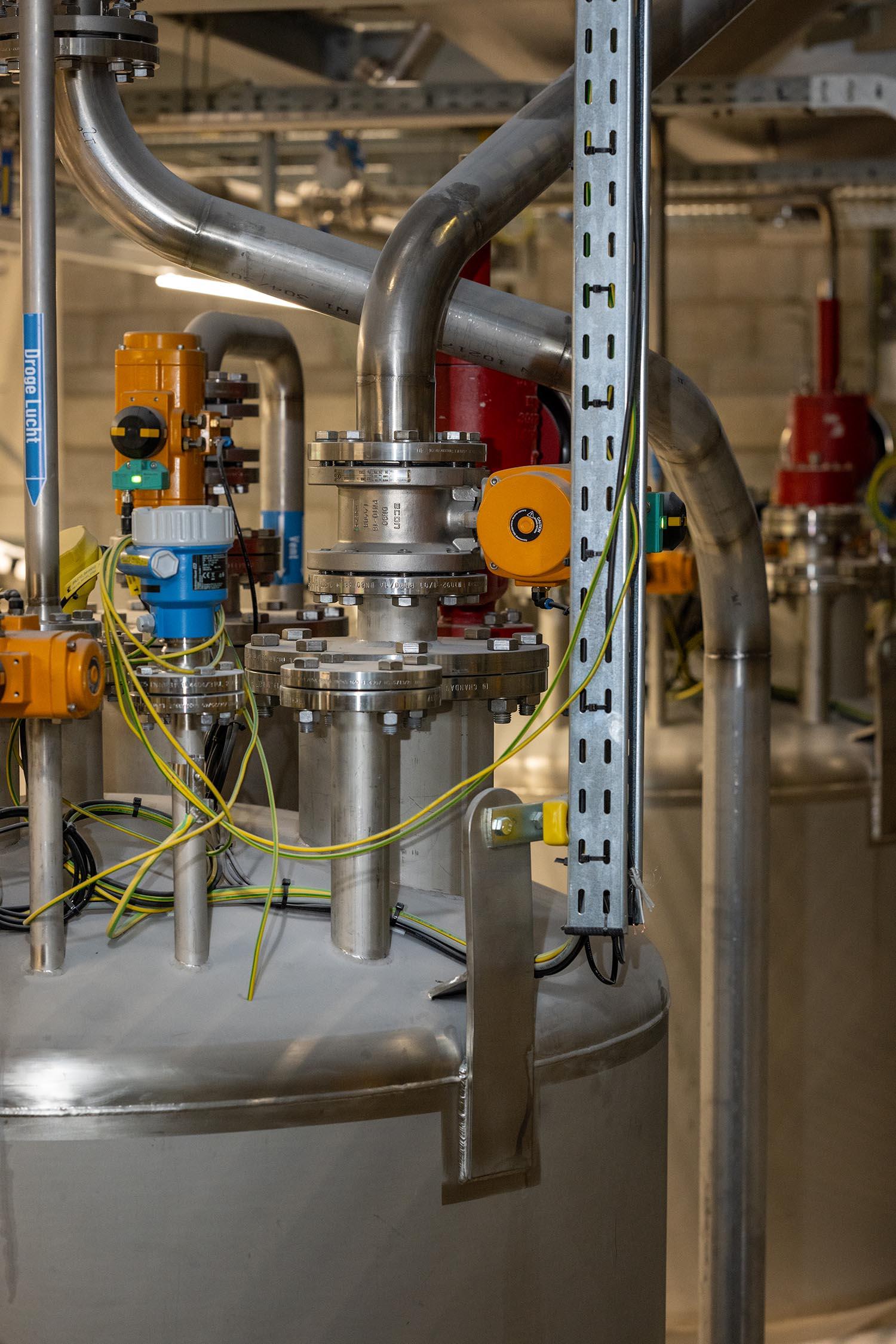 Indinox projectmanager Sophie Martens ziet mee toe op het verloop van de werken. “De tanks worden aangeleverd, maar wij plaatsen ze en zorgen voor al het leidingwerk dat nodig is, verdieping per verdieping. Ook kleppen, afsluiters, instrumentatie monteren we mee in het geheel, net als de nutsleidingen voor water, koelwater, droge lucht, perslucht en stikstof.” Waar mogelijk gebeurt de productie prefab in het atelier, voor de rest van het werk rekent het op een vast team ter plaatse, aangevuld met fitters, monteurs en lassers wanneer nodig. De piping is uitgevoerd in RVS 304. “Geen technische hoogstandjes, de buis moet gewoon zo glad mogelijk zijn dat de siliconen er makkelijk door bewegen. Wel moeten we bij de plaatsing van de afvulleidingen er over waken dat er voldoende afloop is”, vertelt Sophie.